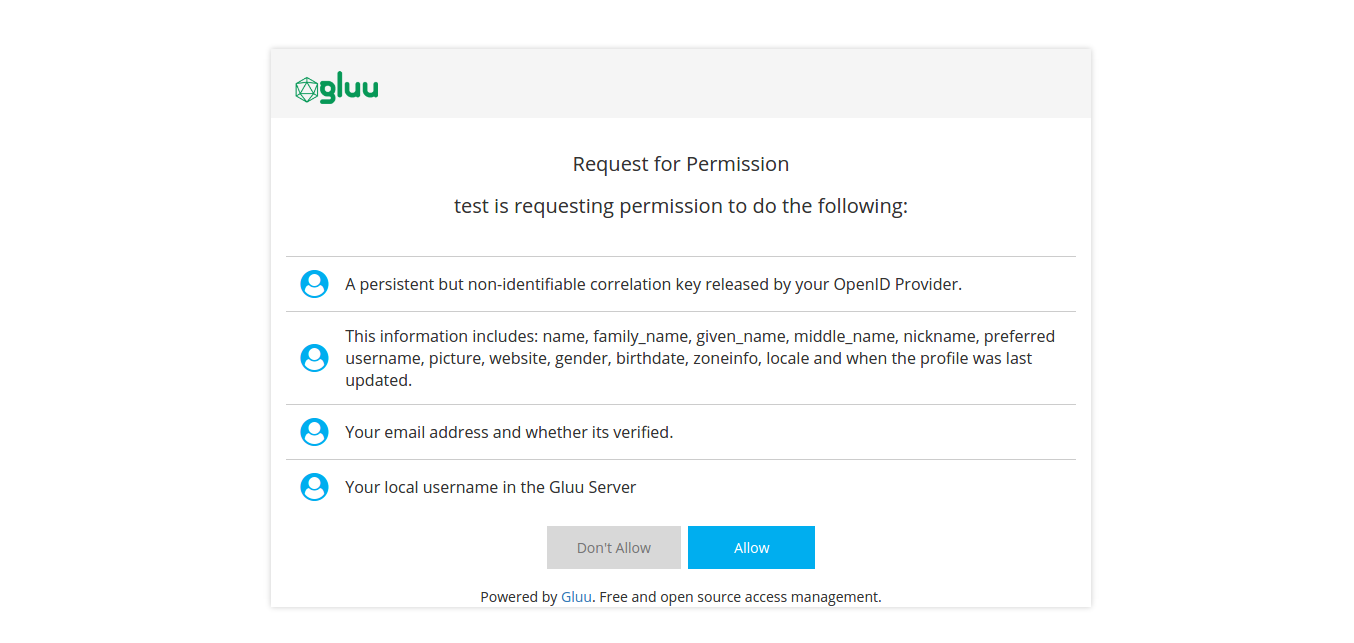 After logging in at the IDP, you will be redirected back to Gluu Server where you might be prompted to authorize release of your personal data to the Demo app.